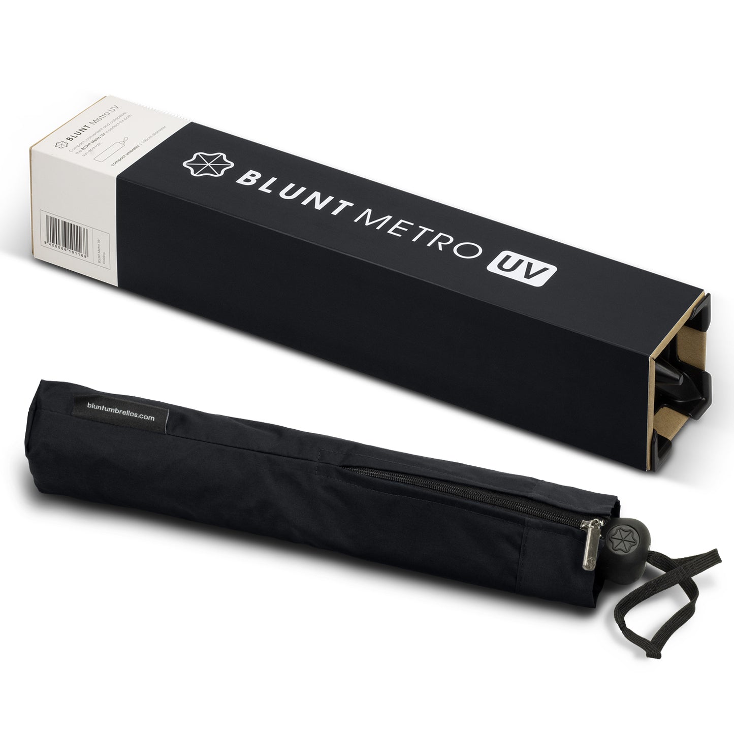 The BLUNT Metro UV Umbrella offers premium protection and standout design, making it ideal for promotional purposes or gifting. Compact and collapsible, it features a 190T pongee canopy with a blackout layer, providing UPF 50+ sun protection. Engineered to endure winds up to 88km/h, its patented tips ensure superior durability and the iconic BLUNT shape. The six-rib aluminium and steel frame is complemented by an automatic opening mechanism and a comfortable, debossed handle. Packaged with a matching sleeve in an unbleached cardboard box, this umbrella combines style and functionality. Co-branding options are available, with some restrictions on artwork alignment.