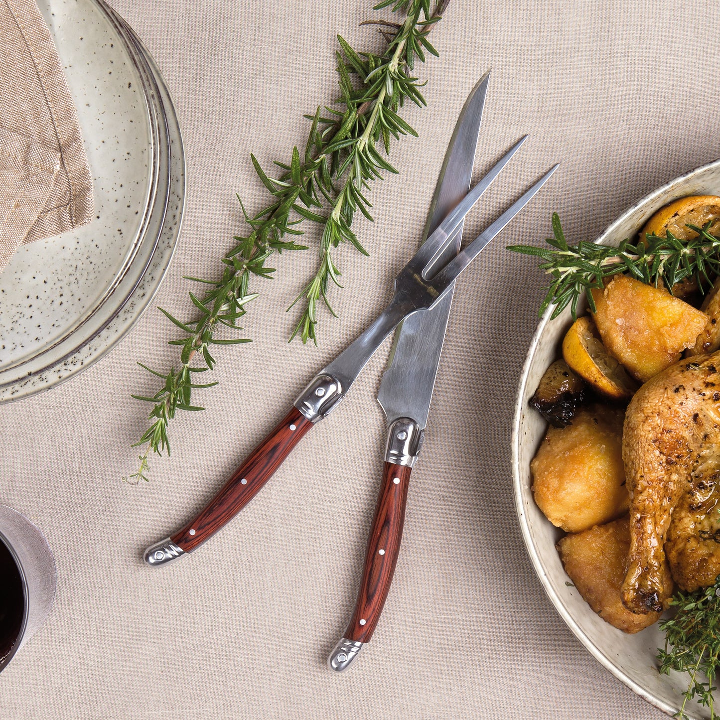 The Bordeaux Carving Set is a 2-piece set that includes a 6.5” carving knife and a 5.5” carving fork, both featuring pakka wood handles with a rosewood colour finish for a touch of elegance. These stainless steel utensils offer excellent precision and durability. Presented in a natural pine cavity die-cut gift box, the set is a sophisticated way to showcase your brand. Supplied in a sleek black gift box, it makes an ideal gift for any occasion.