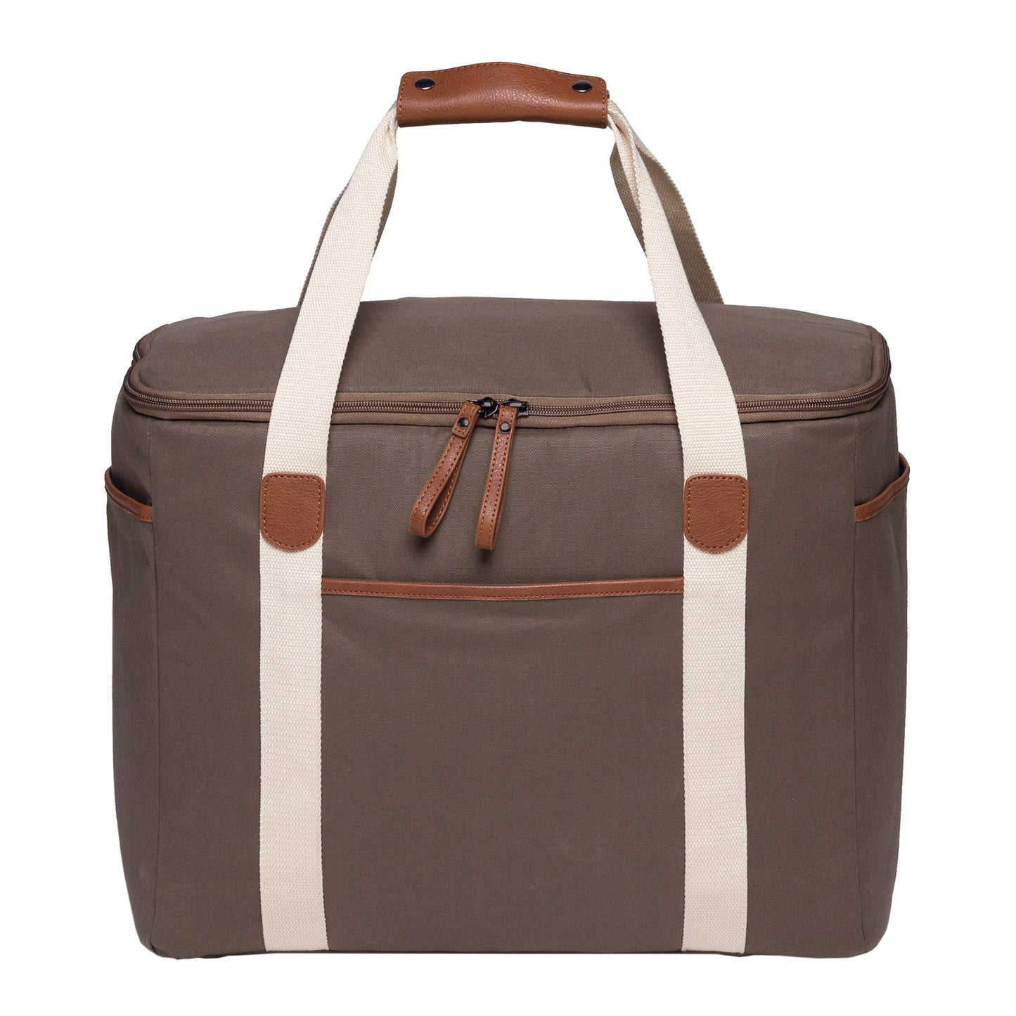 The 30l Hamptons Cooler is crafted from luxurious 12oz waxed cotton canvas with faux leather trim, offering both style and durability. It features a spacious, zippered insulated cooler compartment with a heat-sealed, leak-proof PEVA lining to keep your drinks and food cold. The cooler includes convenient front and end slip accessory pockets, and wide contrast webbing carry handles with a faux leather wrap and dome closure for ease of transport. Gunmetal zip sliders and faux leather zip pullers add a touch of sophistication, making this cooler a perfect option to showcase your brand in a practical yet stylish way.