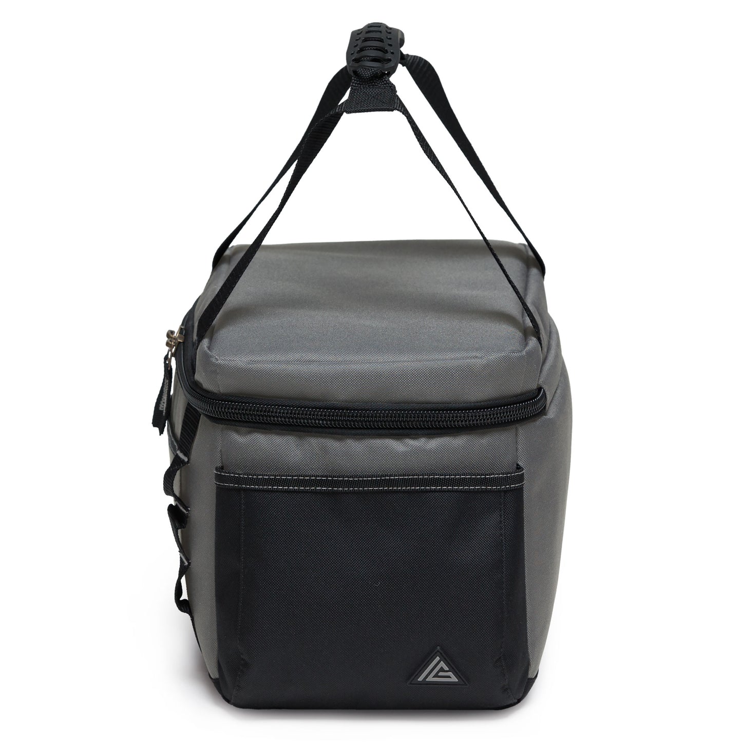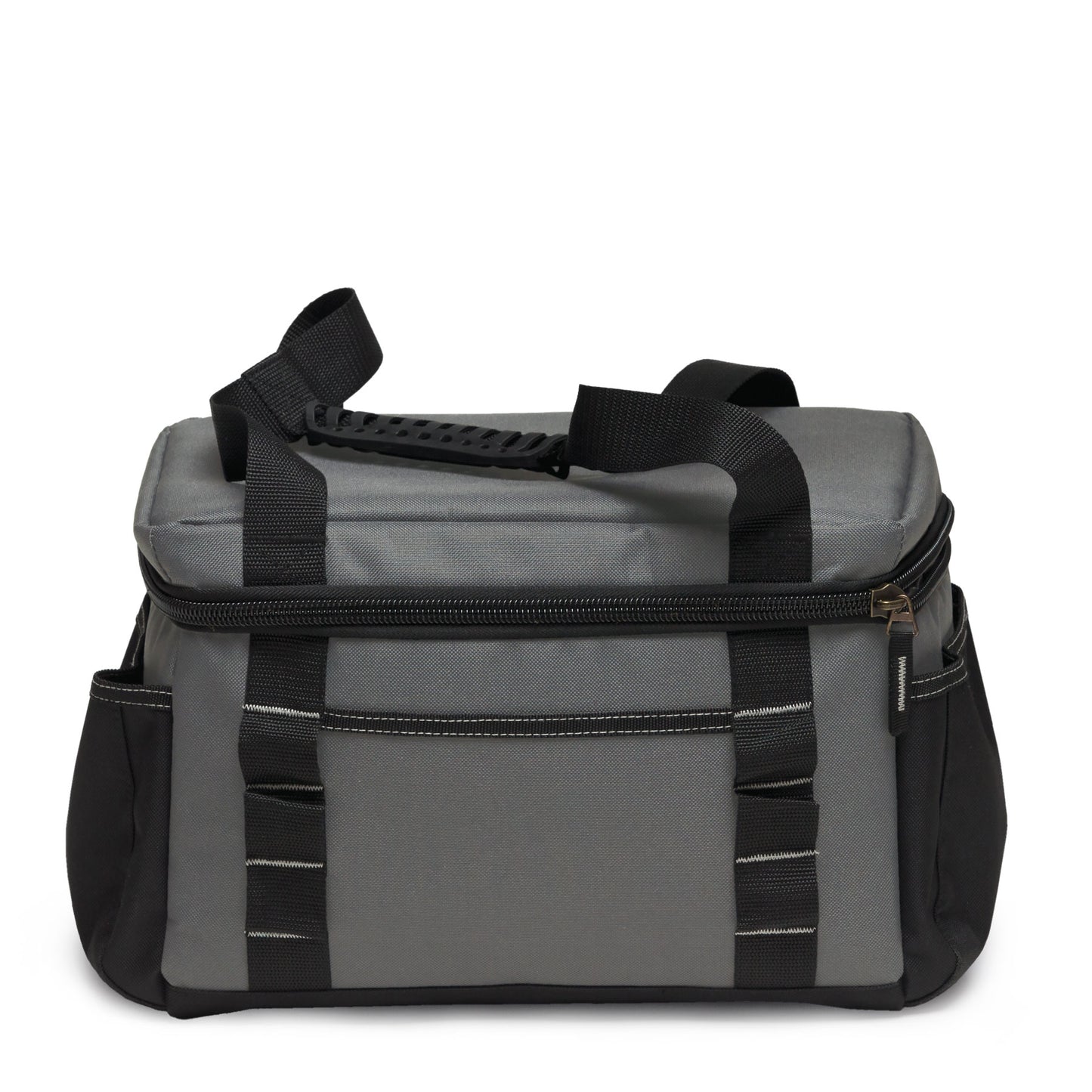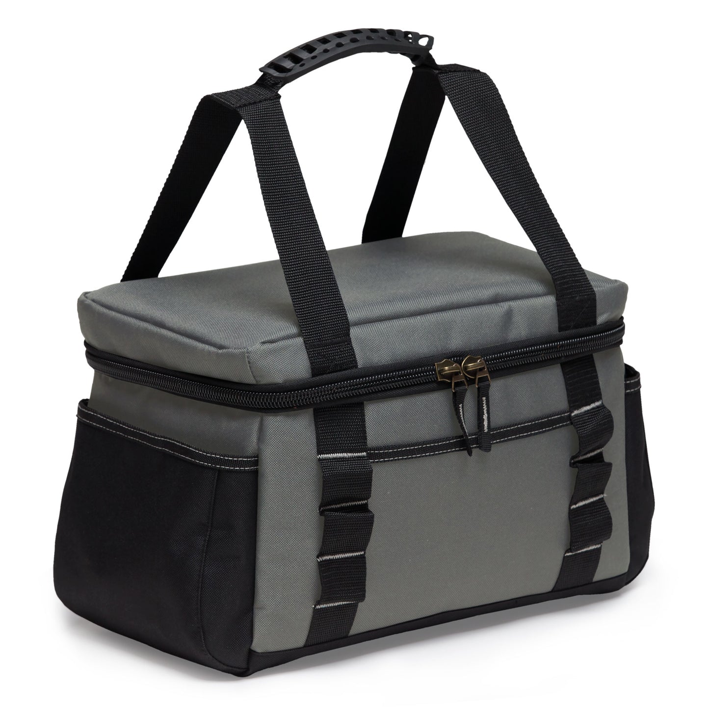 The HardHat Cooler Bag 17L is made from durable 600D polyester with latex rubber backing and features an insulated zippered main cooler compartment with a heat-sealed, leak-proof PEVA lining. It includes a protective baseboard and a top strap design that can carry a jacket, hard hat, or large drink bottle. The bag also offers a moulded rubber grab handle, antique brass zip sliders, and a front slip pocket. Additional features include dual end accessory slip pockets with Velcro closures, daisy chain loops for accessory attachments, an internal zippered mesh pocket with a 200ml ice brick, and rubber feet for protection. Ideal for custom branding, it presents an excellent opportunity to showcase your logo or design.