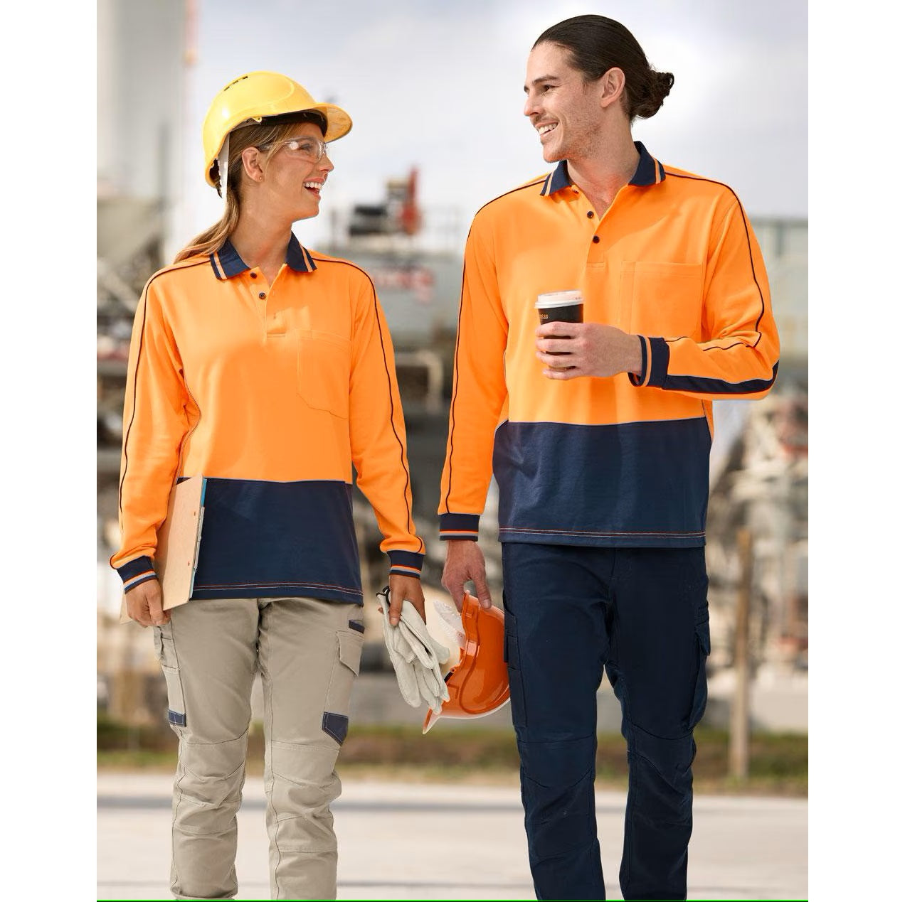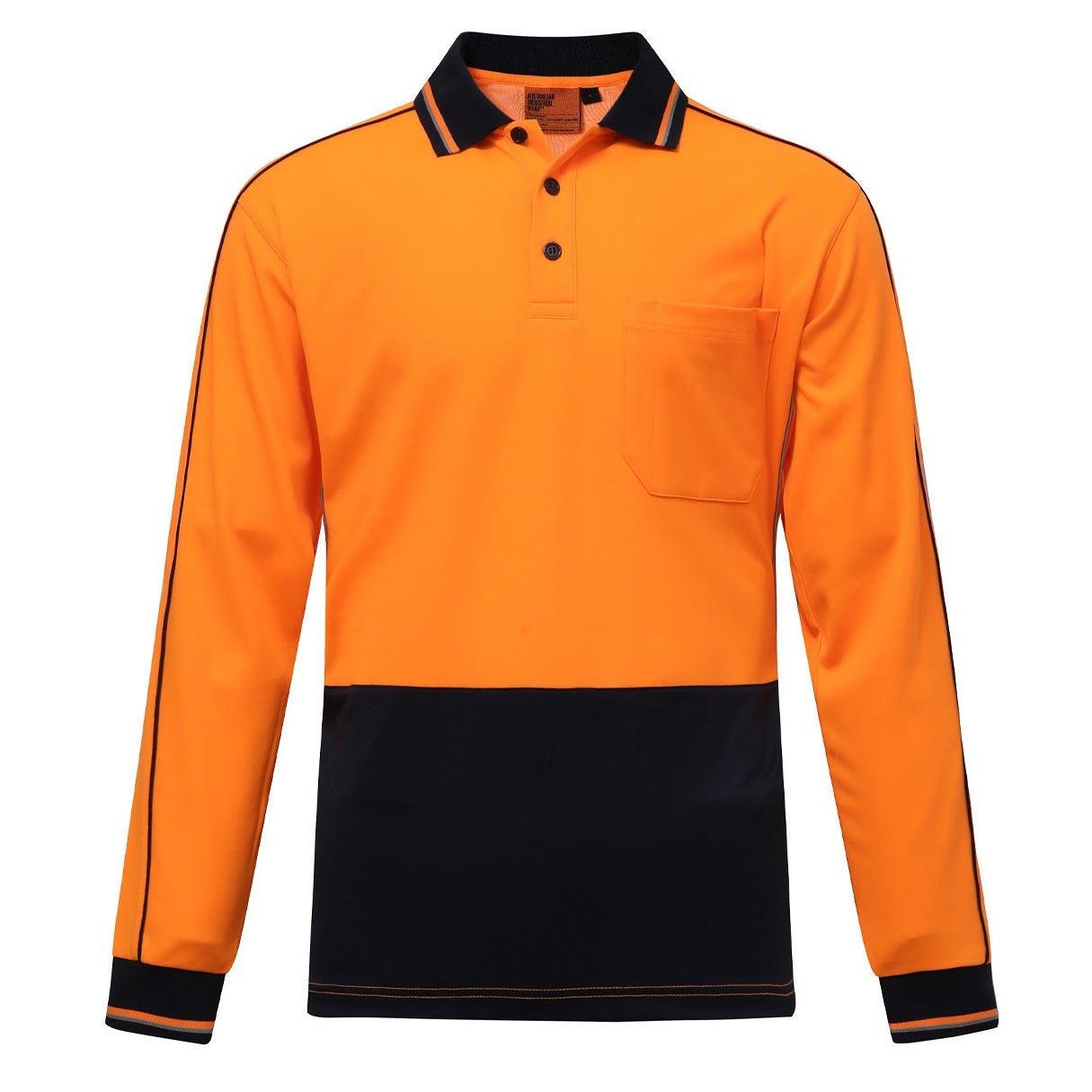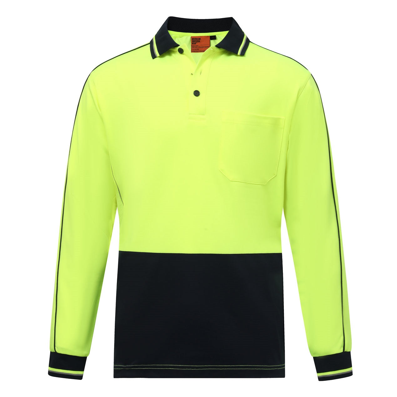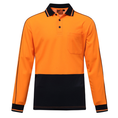 Designed for safety and comfort, this hi-vis long-sleeve polo is made from 65% certified recycled PET and 35% cotton in a breathable 165gsm knit. Featuring TrueDry® moisture-wicking technology, a ribbed contrast collar and cuffs, a navy contrast front panel, and mesh side panels with reflective piping, it offers durability and all-day wearability. Functional details include a front pocket with a pen divide, contrast insert panels, and piping along the shoulders and sleeves, meeting AS/NZS 4602.1:2011 Class D day-use safety standards. Elevate your brand with a sustainable edge. Also available in a short-sleeve style.