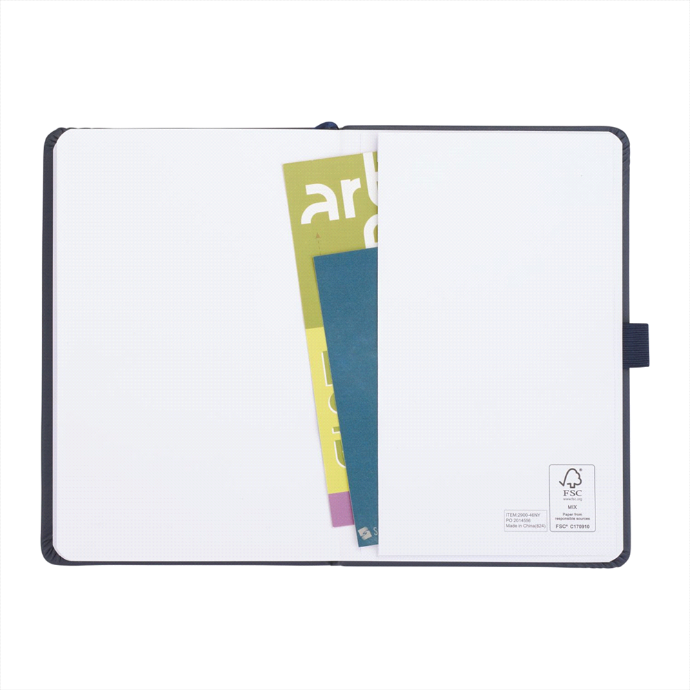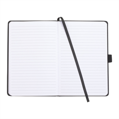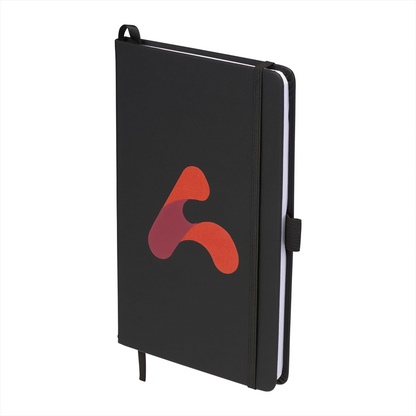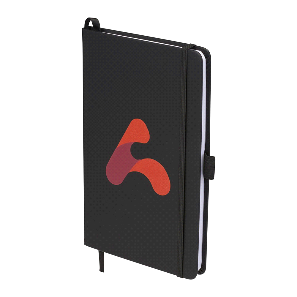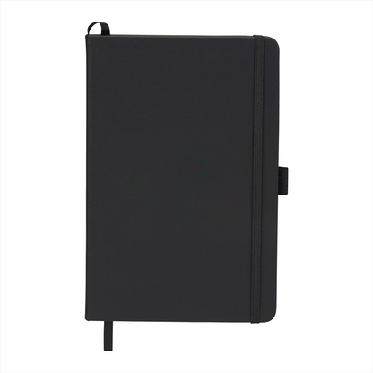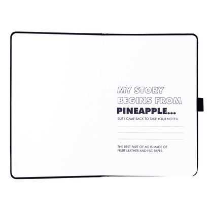 Crafted from innovative materials, this 5.5" x 8.5" journal blends 30% repurposed pineapple content in its hardcover with certified sustainable white-lined paper inside. It features 80 sheets, a colour-matching elastic closure, pen loop, ribbon marker, and a back document pocket for added functionality. Designed with eco-conscious appeal, it’s best suited to digital print branding, allowing your identity to stand out without compromising the journal’s unique surface.