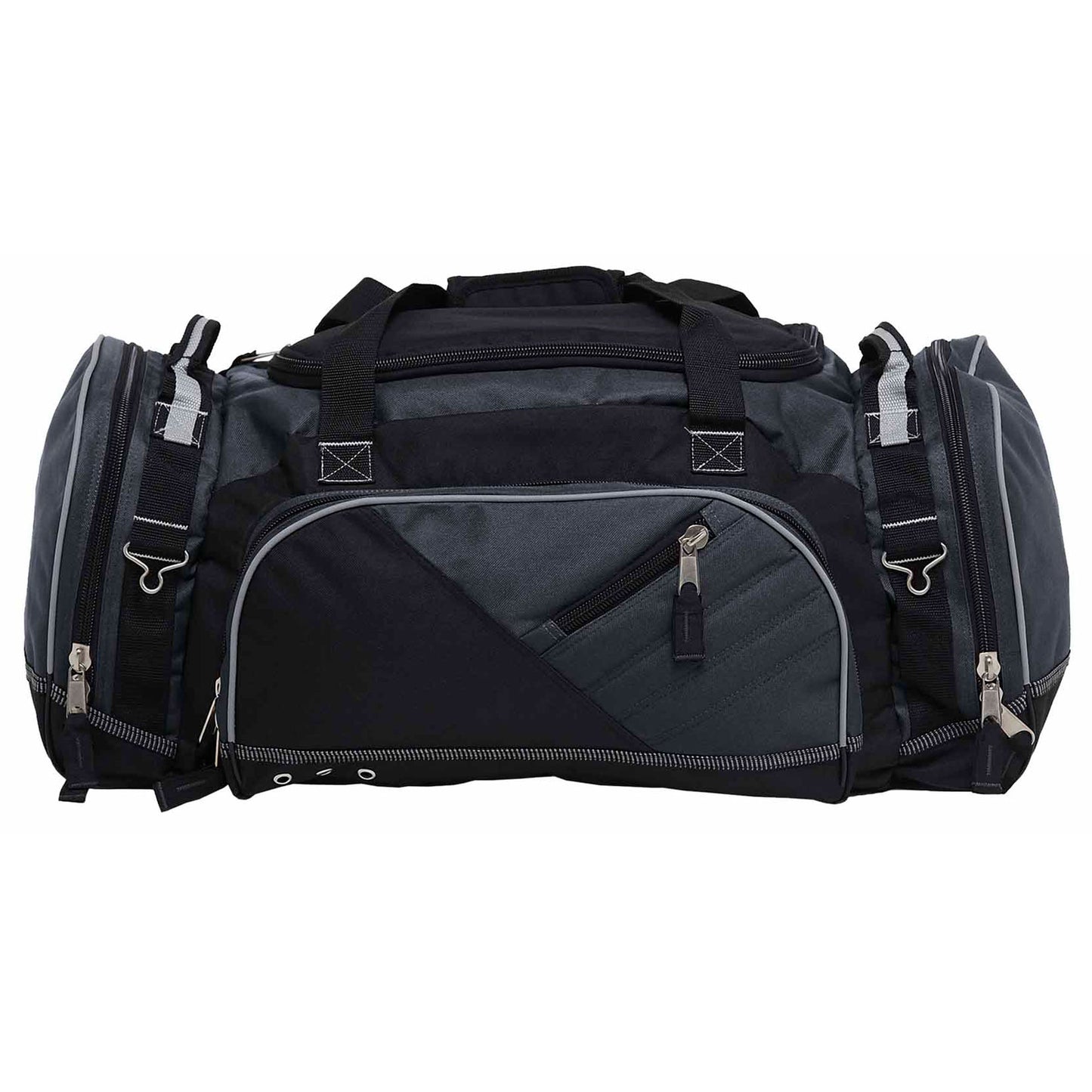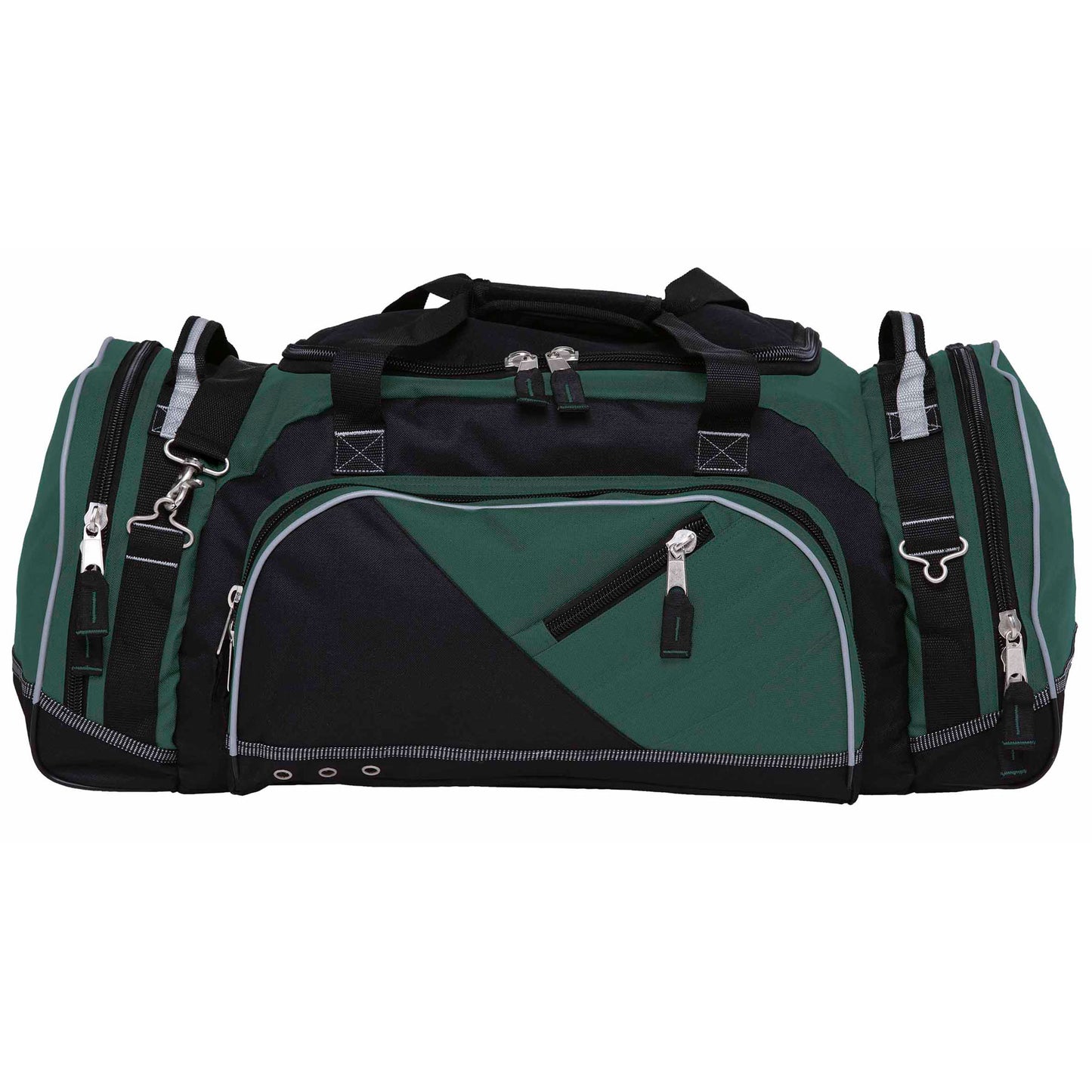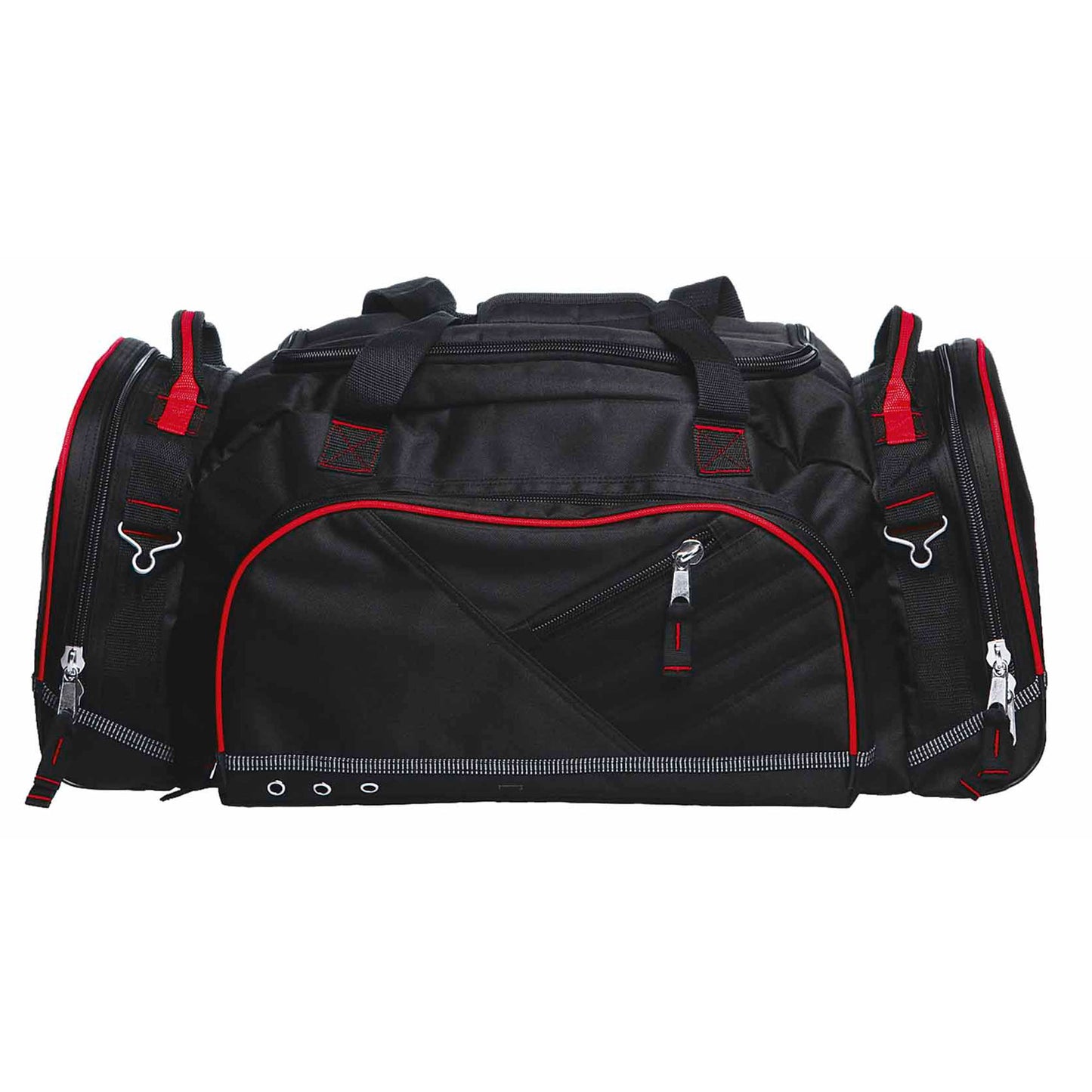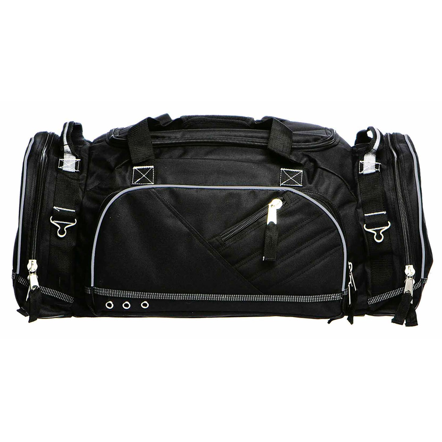 The Recon Sports Bag, made from durable 600D polyester with latex rubber backing, offers a large main compartment with an oversized U-shaped double zippered opening, complemented by two end compartments with reflective piping and a side zippered accessory pocket. It includes a Velcro wrap carry handle, multiple grab handles, and an adjustable padded shoulder strap with quick-release metal buckles. Heavy-duty zippers, accessories, and rubber feet enhance durability, providing ample space and visibility to display your brand effectively.