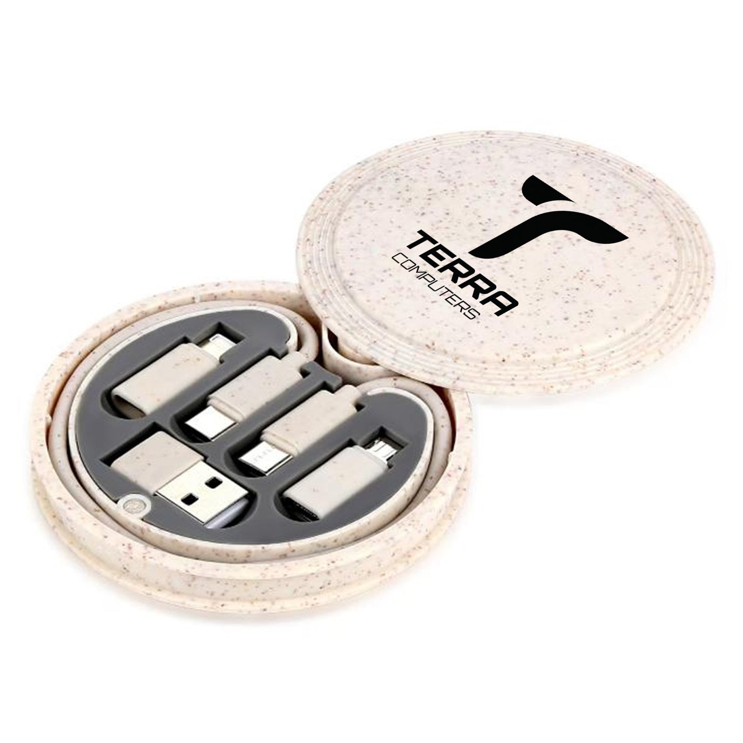 Choose from natural wheatstraw for an earthy, eco-conscious feel, or vibrant recycled ABS colours that make a bold statement while supporting responsible production. Inside, fast-charging adapters for Type C, Type A, Micro USB, and iOS ensure you’re ready for anything, all snugly secured by a sleek grey insert.