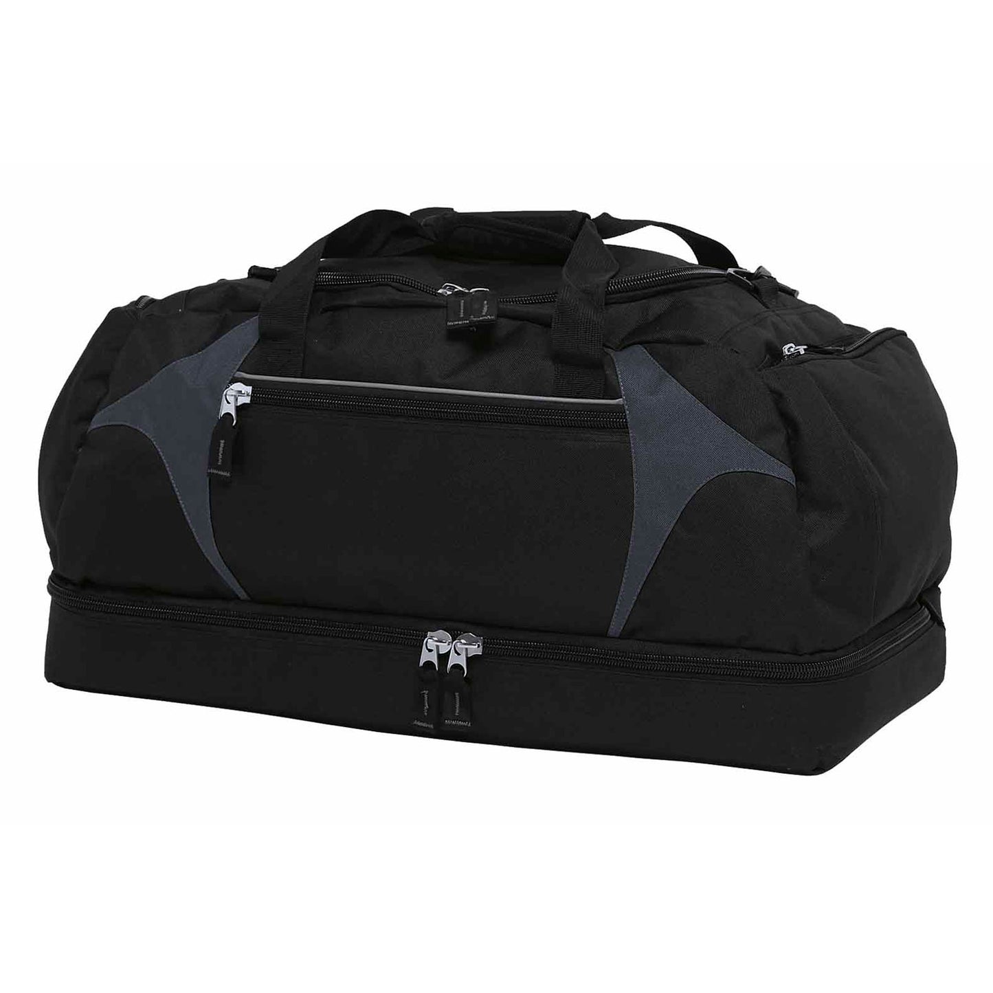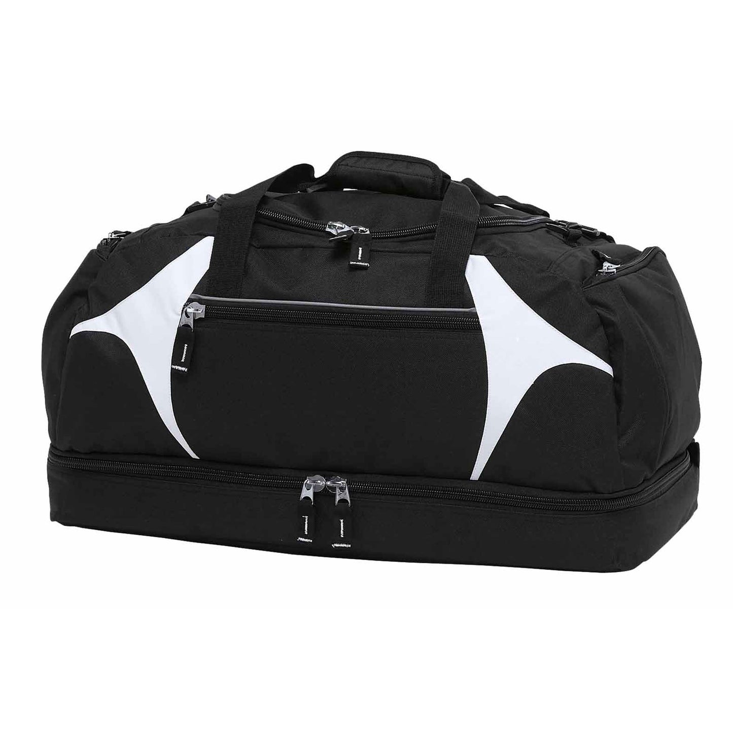 The Spliced Zenith Sports Bag is made from durable 600D polyester with latex rubber backing, offering a large main compartment with a U-shaped zippered opening. It includes a quick-stash front pocket with reflective piping, two zippered end compartments, and a drop-bottom zippered compartment for extra storage. The bag features a detachable, adjustable padded shoulder strap, a Velcro wrap carry handle, and heavy-duty zippers. With rubber feet for added protection, it can be branded to showcase your logo.