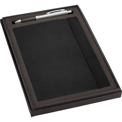 A refined and practical gift set, the Ambassador Journal & Pen Set is designed for a premium writing experience. The hardcover bound journal features an expandable accordion pocket, a built-in elastic closure, and a ribbon marker, with 80 sheets of lined off-white paper. Paired with the Nash retractable ballpoint pen, featuring a soft grip for comfortable use, this set is elegantly presented in a custom-made two-piece gift box with a foam insert, making it an excellent showcase for custom branding.
