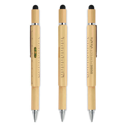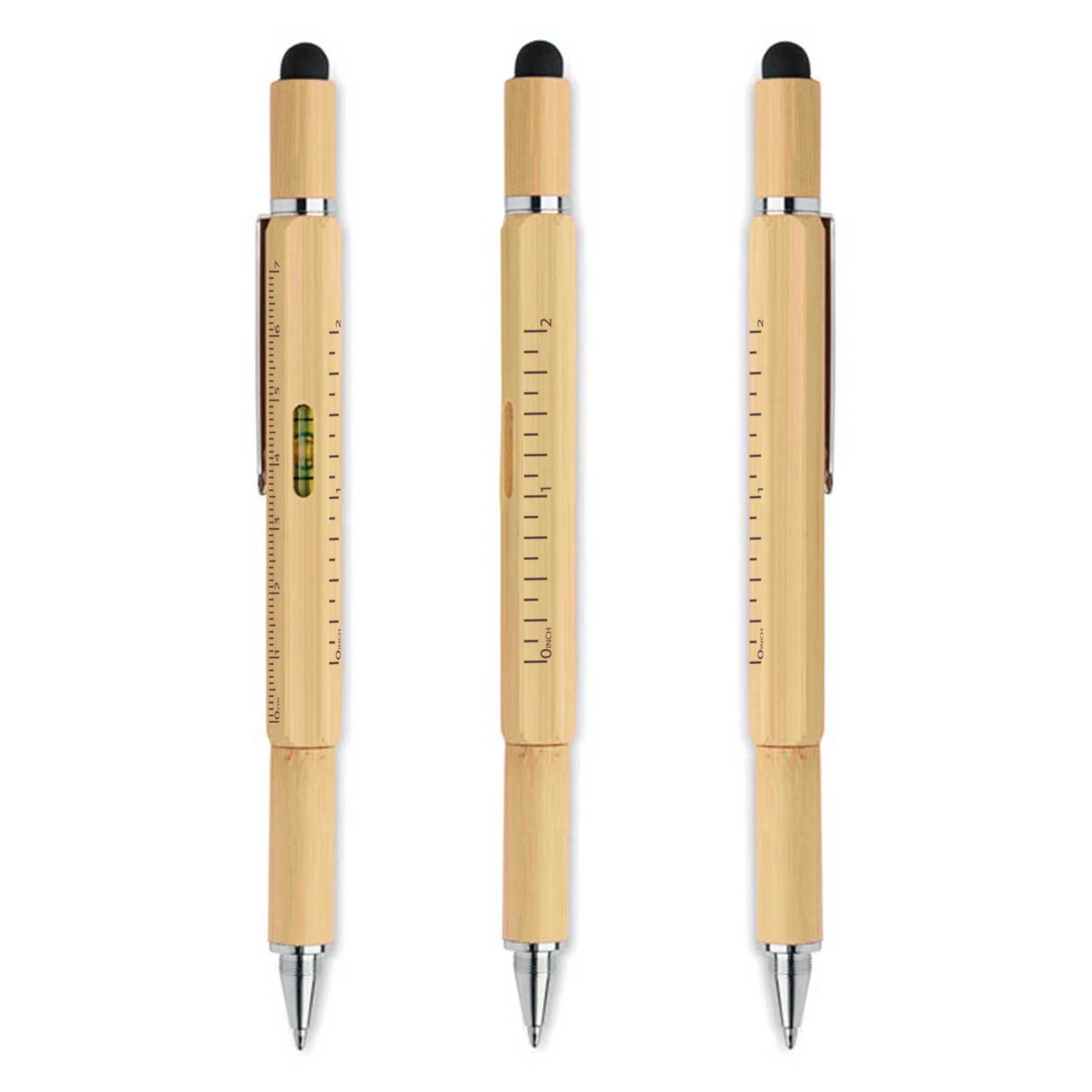 More than just a pen, this bamboo tool pen is a multitasking powerhouse! With a smooth twist-action design, it features a built-in spirit level, both 7cm and 2-inch rulers, Philips and flat-head screwdriver bits, and an integrated stylus for ultimate versatility. The sleek silver metal clip adds a stylish touch, while the premium German-made black ink refill ensures up to 1200 metres of effortless writing with its tungsten carbide ball. A must-have tool that blends practicality with eco-friendly appeal—perfect for showcasing your brand in a smart and sustainable way!