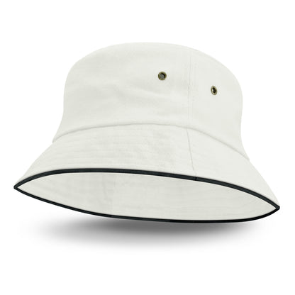 A classic bucket hat with a modern edge, crafted from premium cotton twill and accented with a sleek black trim. Designed for all-day comfort, it features a sweatband and metal eyelets for breathability, while the UPF50-rated fabric offers outstanding sun protection. Available in three versatile sizes, including kids, this stylish hat is perfect for showcasing your brand in the sun!