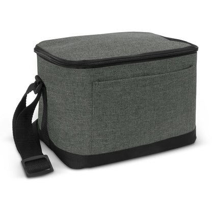 Small 4L cooler bag with PE foam insulation encased in a water-resistant PEVA inner liner. The outer construction is poly-canvas with an on-trend heather style finish. It has a zippered top closure, a slip pocket on the front and an adjustable woven shoulder strap.