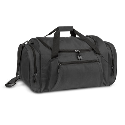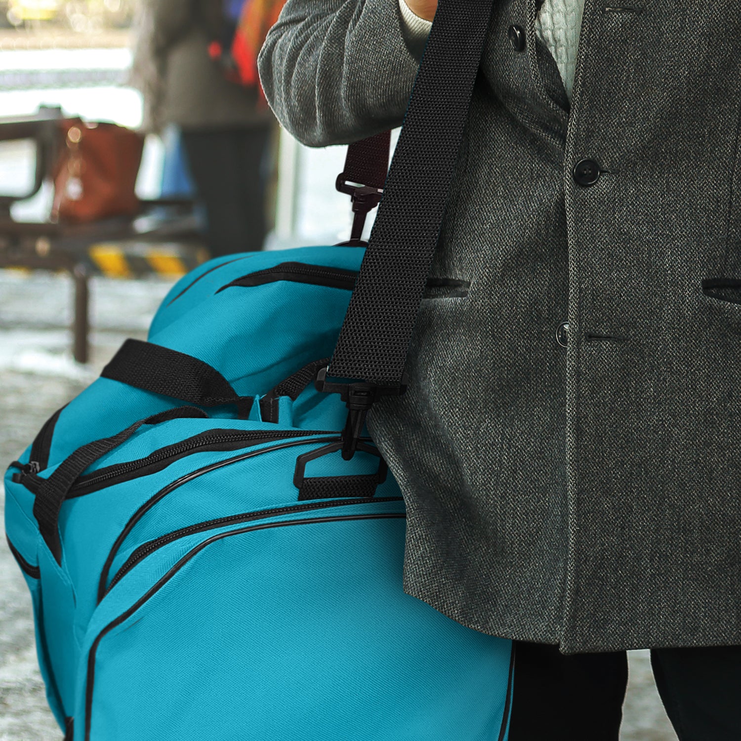 This large duffle bag is made from durable 600D polyester, offering ample space with a 37L capacity. It features an adjustable, removable shoulder strap with a curved shoulder pad for maximum comfort, along with woven carry handles and a Velcro cuff for easy transport. The bag also includes a sturdy reinforced base with plastic feet for added stability, as well as three zippered external pockets and two additional external pockets for convenient storage.