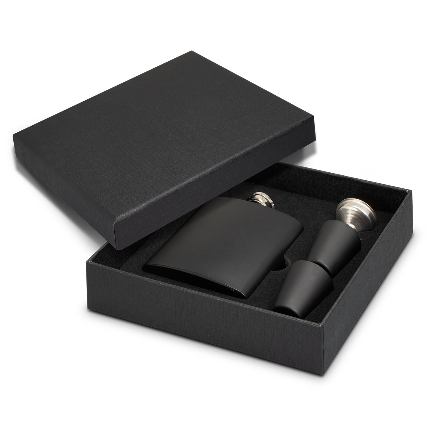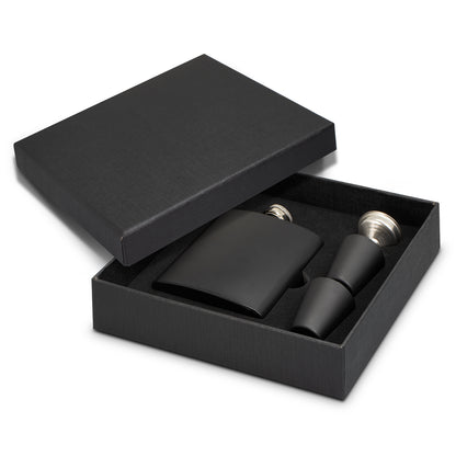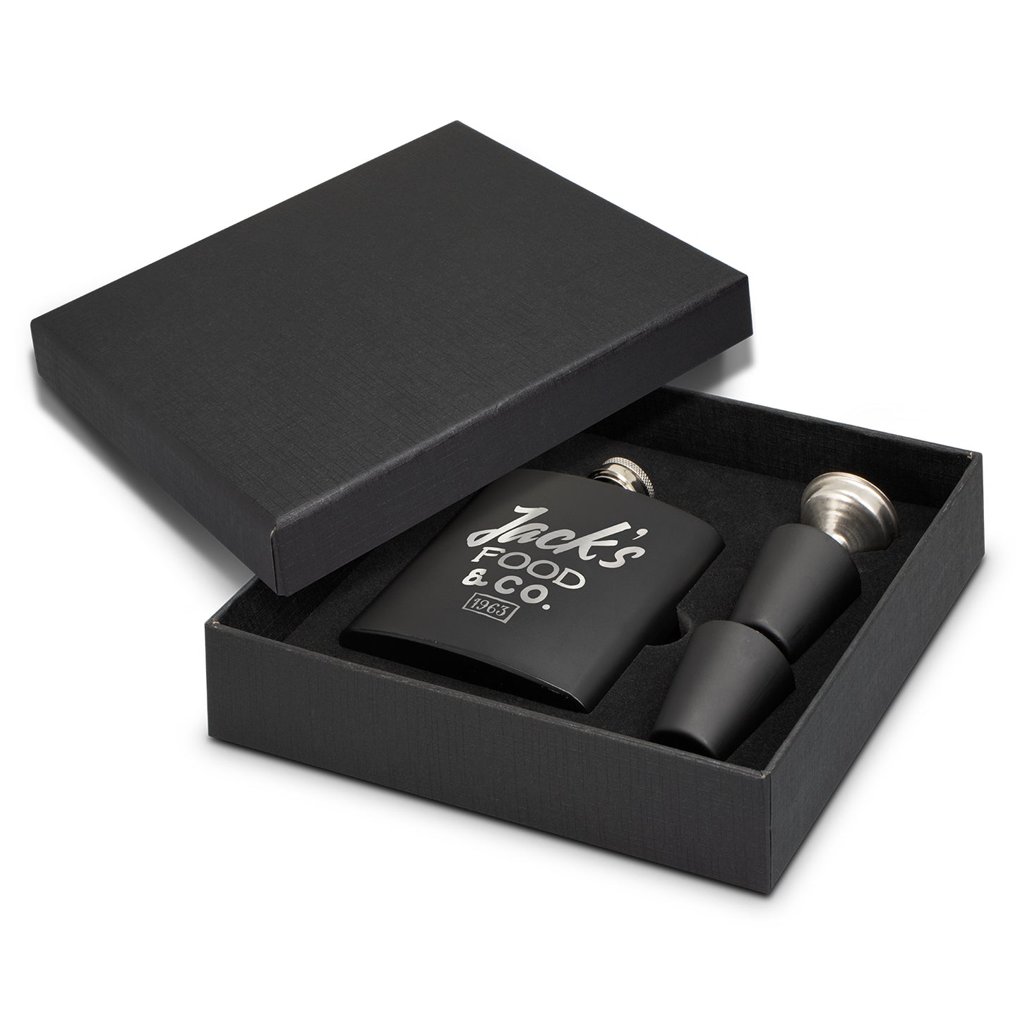 This premium 170ml stainless steel hip flask gift set includes two shot glasses and a funnel, all presented in a sleek black gift box. The flask features a screw-on flip closure and a matte painted finish, combining style with functionality. Ideal for custom branding, the shiny steel engraving finish ensures a durable and refined presentation. Perfect for gifting or promotional purposes, it offers a sophisticated way to showcase your brand.