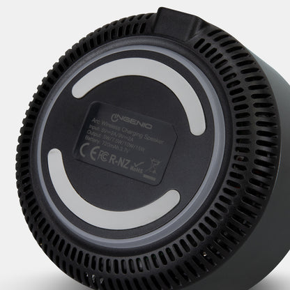 Elevate your tech game with the INGENIO Arc Wireless Charging Speaker, where cutting-edge design meets premium functionality. This sleek speaker combines Bluetooth connectivity and wireless charging, offering high-quality sound alongside intuitive controls for track navigation, call management, and number recall. An LED light ring on the base indicates charging status, while the speaker's elegant black glass finish and refined copper accents make it a standout piece. Perfectly presented in an INGENIO gift box, this speaker is an exceptional corporate gift and a true statement of your brand's innovation.