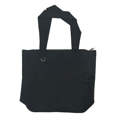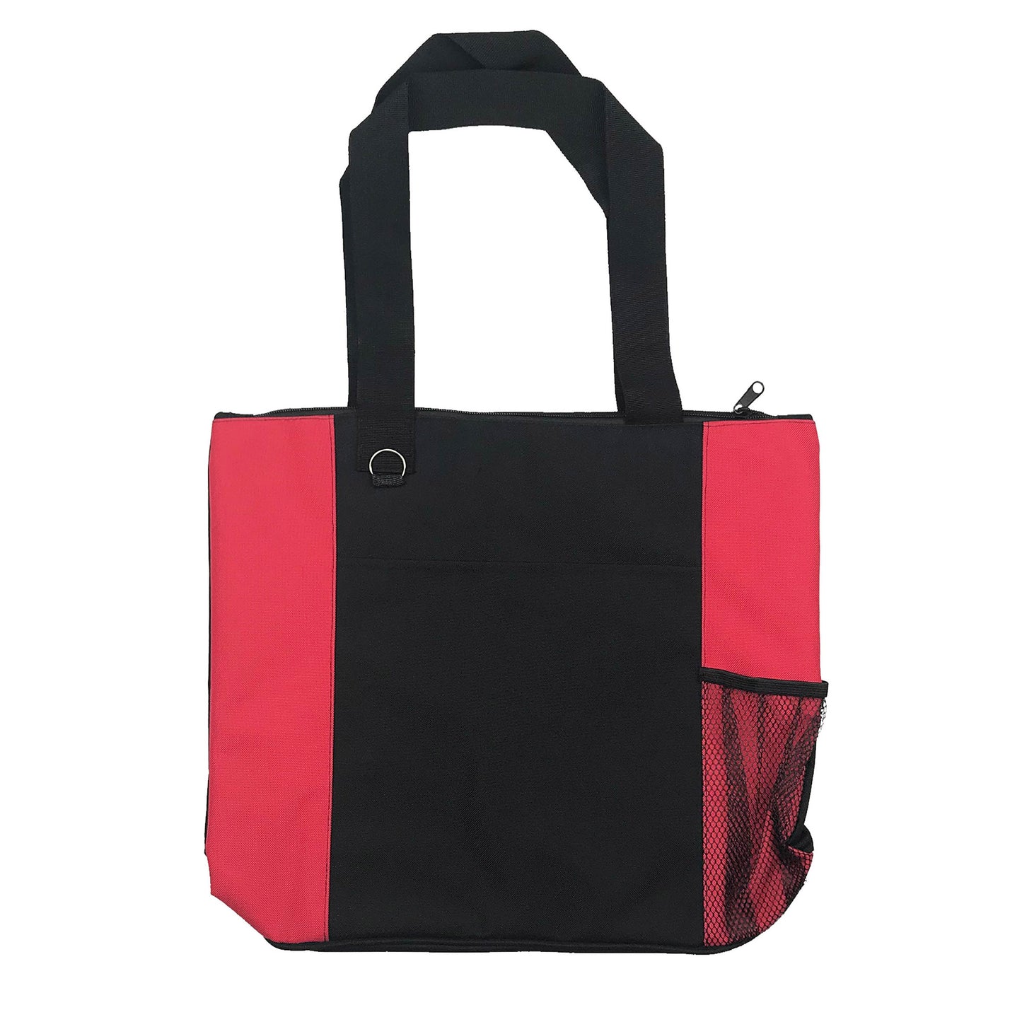 Carry your essentials in style with this modern nylon shopping tote, crafted from durable 600D polyester. The sleek black design is accented with a coloured side panel, while a handy front pouch, zip closure, keyring hoop, and mesh side pocket add practicality. Sturdy black web handles ensure a comfortable carry, making it a great choice for daily errands or events. Showcase your brand with bold custom decoration on this trendy and functional tote.