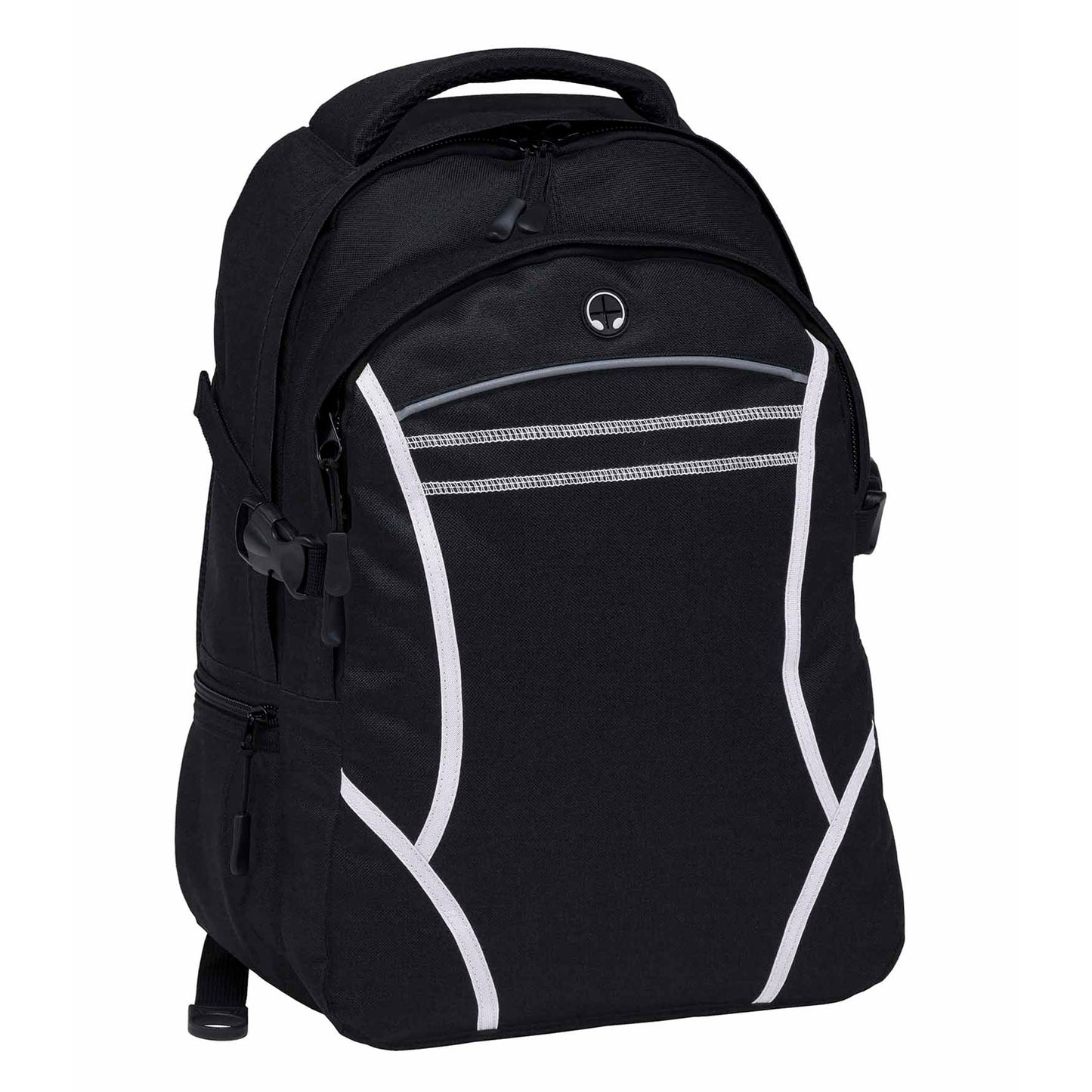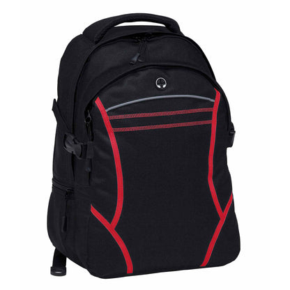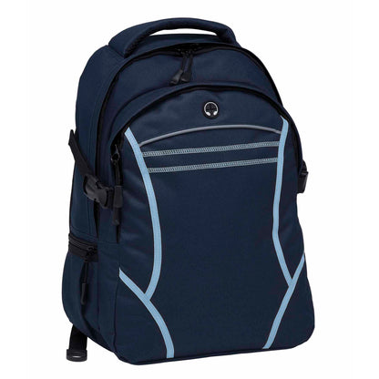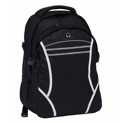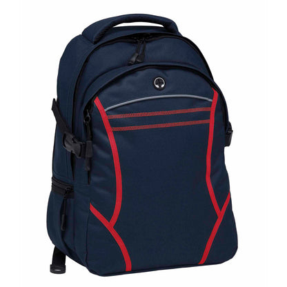 The Reflex Backpack features two separate storage compartments, including a padded iPad compartment with an adjustable Velcro closure. It showcases contrast fabric detailing and reflective piping on the front, along with twin cover stitch accents. The backpack offers mesh-backed shoulder straps and contoured padded mesh back panels for comfort, quick-release side compression straps, and a zippered side accessory pocket. With a mesh drink bottle pocket, heavy-duty zippers, and rubber feet for added protection, this practical and durable backpack can be customised to showcase your brand.