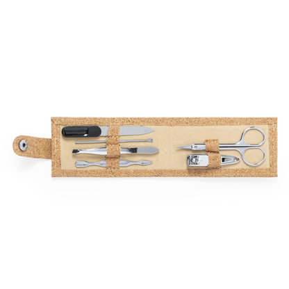Keep grooming essentials close at hand with this nature-inspired manicure set, presented in a stylish cork case that highlights natural materials while reducing environmental impact. Featuring six stainless steel tools, including scissors, tweezers, nail clippers, a nail file, and two cuticle removers, it folds out completely for easy access and a seamless brand showcase. The secure button closure ensures everything stays neatly stored, making it a practical and stylish addition to any collection.