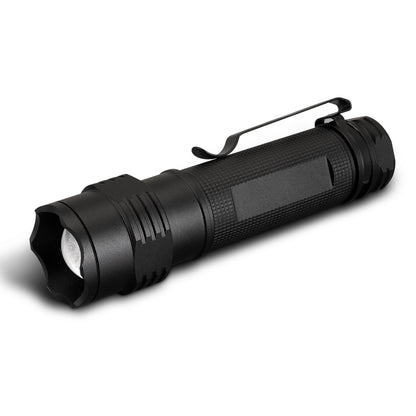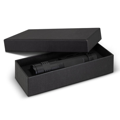 Bright, powerful and built to perform, this 3W LED torch delivers up to 300 lumens of adjustable light, making it a reliable companion for any low-light environment. Crafted from sleek metal with a practical belt clip, it includes a 1200mAh rechargeable battery and USB charging cable for convenience. With up to five hours of use per charge and a quick 2.5-hour recharge time, it's ready when you need it. Custom branding stands out in oxidised white when laser engraved, presented stylishly in a black gift box to make a bold impression.